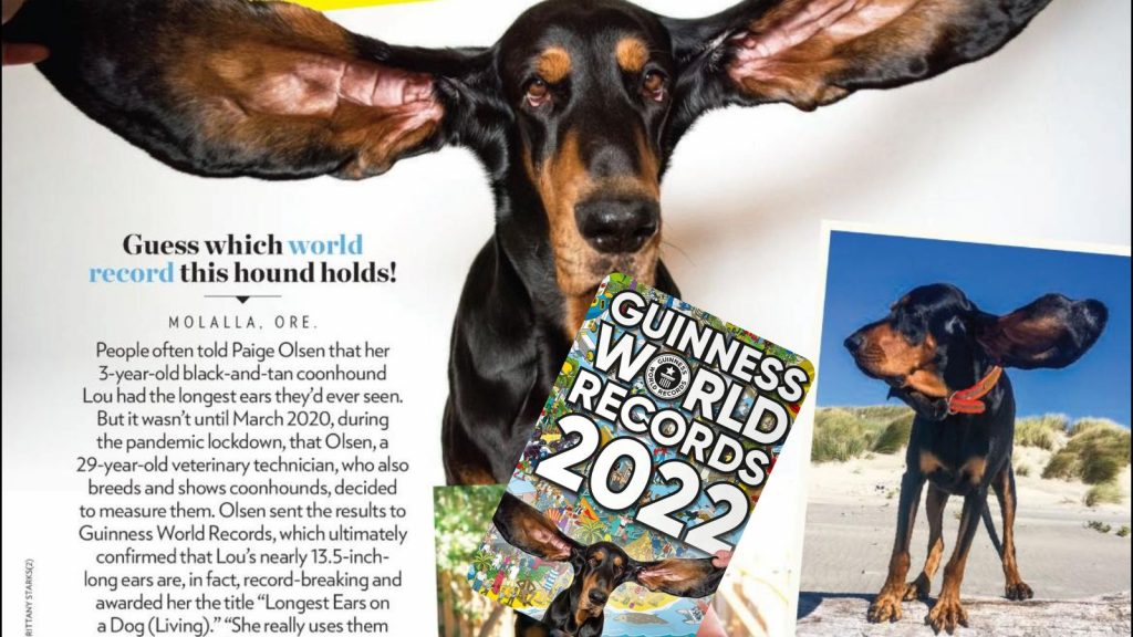 Na naslovnici Guinnesove knjige svjetskih rekorda za 2022. godine nalazi se pas s najdužim ušima na svijetu. To je ženka američke pasmine koja se punim imenom zove crni gonič rakuna s paležom (Black and Tan Coonhound), zovu je Lou i svako joj je uho dugačko 34 centimetra.