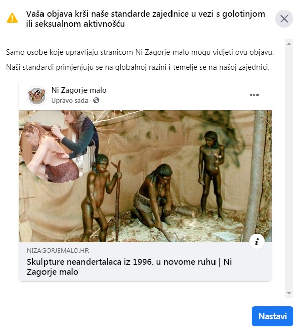 U međuvremenu je Facebook policija odlučila da ipak nije riječ ni o kakvoj pornografiji, pa je objava vraćena na Facebook stranicu Ni Zagorje malo. No, kad smo objavu željeli podijeliti u Facebook grupama, ponovno su nas cenzurirali tvrdeći da dijelimo neprimjeren sadržaj.
