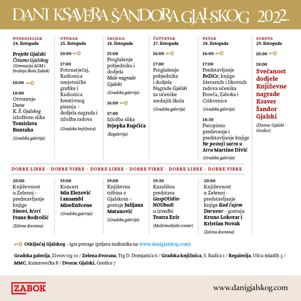Dani Gjalskoga počinju Projektom Gjalski, Čitajmo Gjalskoga. Svečanost otvorenja ovogodišnje manifestacije je u Gradskoj galeriji Zabok izložbom slika Tomislava Buntaka.