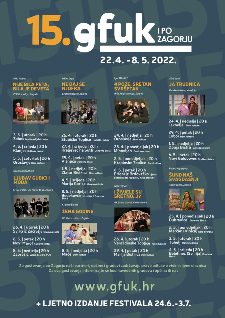 15. GFUK i po Zagorju počinje u Krapini 22. travnja predstavom Boeing, Boeing. A onda glumačke družine idu dalje: Oroslavje, Jakovlje, Mihovljan, Dubravica, Varaždinske Toplice, Sveti Križ Začretje, Stubičke Toplice, Kraljevec na Sutli, Marija Bistrica, Višnjica, Lobor, Zlatar Bistrica, Bistra, Vinica, Krapinske Toplice, Zabok, Tuhelj, Klanjec, Marija Gorica, Sveti Ilija, Novi Gulubovec, Brdovec, Novi Marof, Bedekovčina, Mače i Zaprešić.
