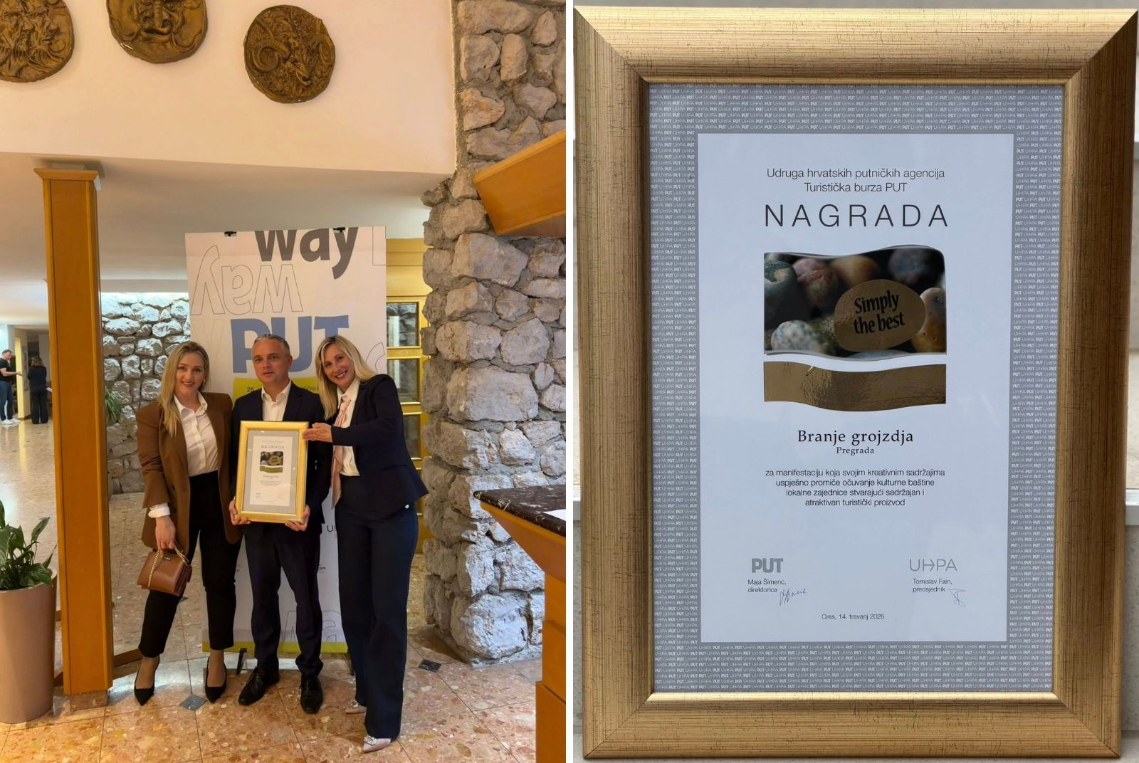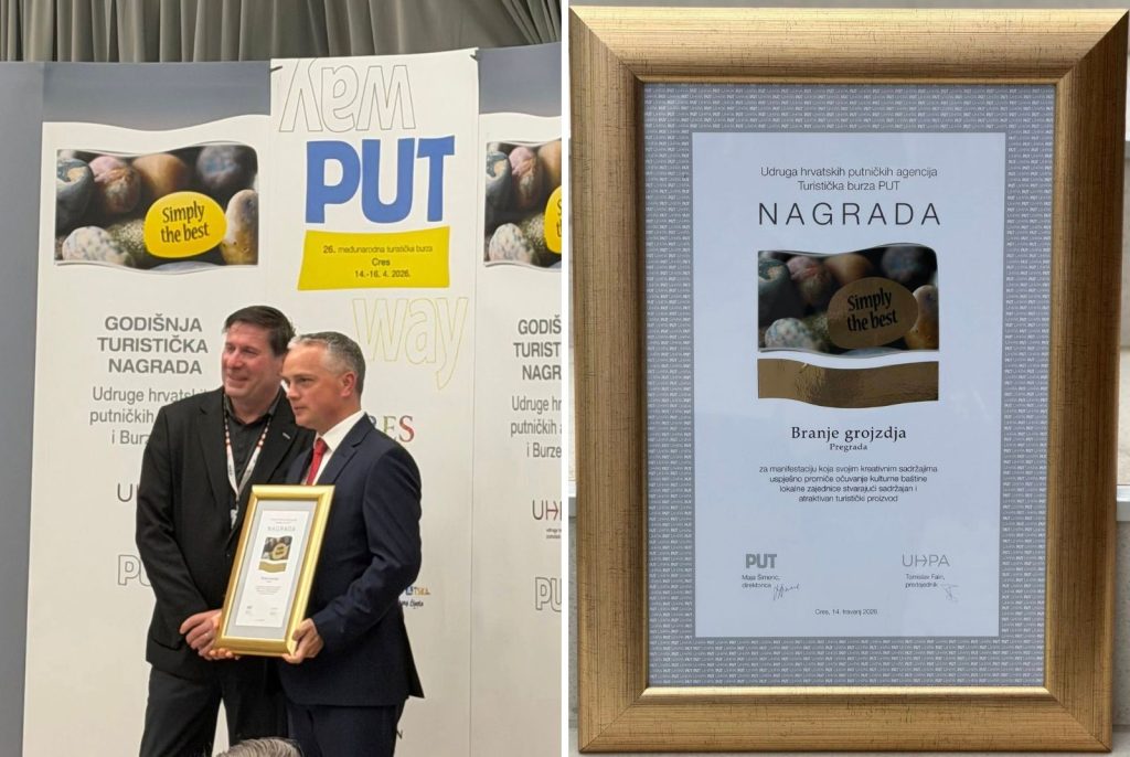 U Pregradu je stigla nacionalna turistička nagrada Simply the best za manifestaciju Branje grojzdja, u kategoriji tradicijskih kulturno – zabavnih manifestacija. Nagradu je na otoku Cresu, u sklopu svečanog otvorenja 26. Međunarodne turističke burze PUT, preuzeo gradonačelnik Pregrade Goran Vukmanić, a svečanosti su nazočile i direktorica Turističke zajednice područja Srce Zagorja Zlatka Vuglec te Bojana Štruk, viša stručna suradnica u TZ-u.