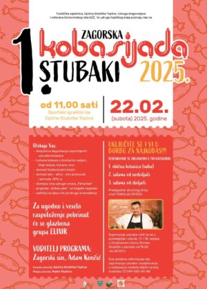 Svi su dobrodošli na druženje na 1. Zagorsku kobasijadu u subotu, 22. veljače od 11 sati na Sportsko igralište kod Općine Stubičke Toplice. Organizator je Turistička zajednica Stubičke Toplice, Udruga dragovoljaca i veterana Domovinskog rata Krapinsko-zagorske županije te udruge topličkog kraja.