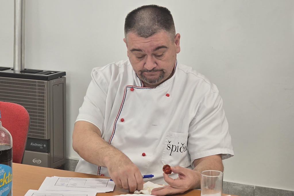 – To je profil češnjofki, odnosno kranjskih kobasica i mogu biti složene u parovima ili malo veće duljine poput slavonskih. Salame imaju točno određenu debljinu crijeva, a standardna dužina je 40 centimetara. Bitno je da crijeva budu od prirodnog materijala. Osim vanjskog izgleda, koji je jedan od kriterija, ocjenjivali smo izgled na prerezu i ono najvažnije, okus. Uz okus, bitan je i miris. Važna je i fermentacija, koja bi u pravilu trebala trajati 60 dana – pojasnio je Čižmešija.