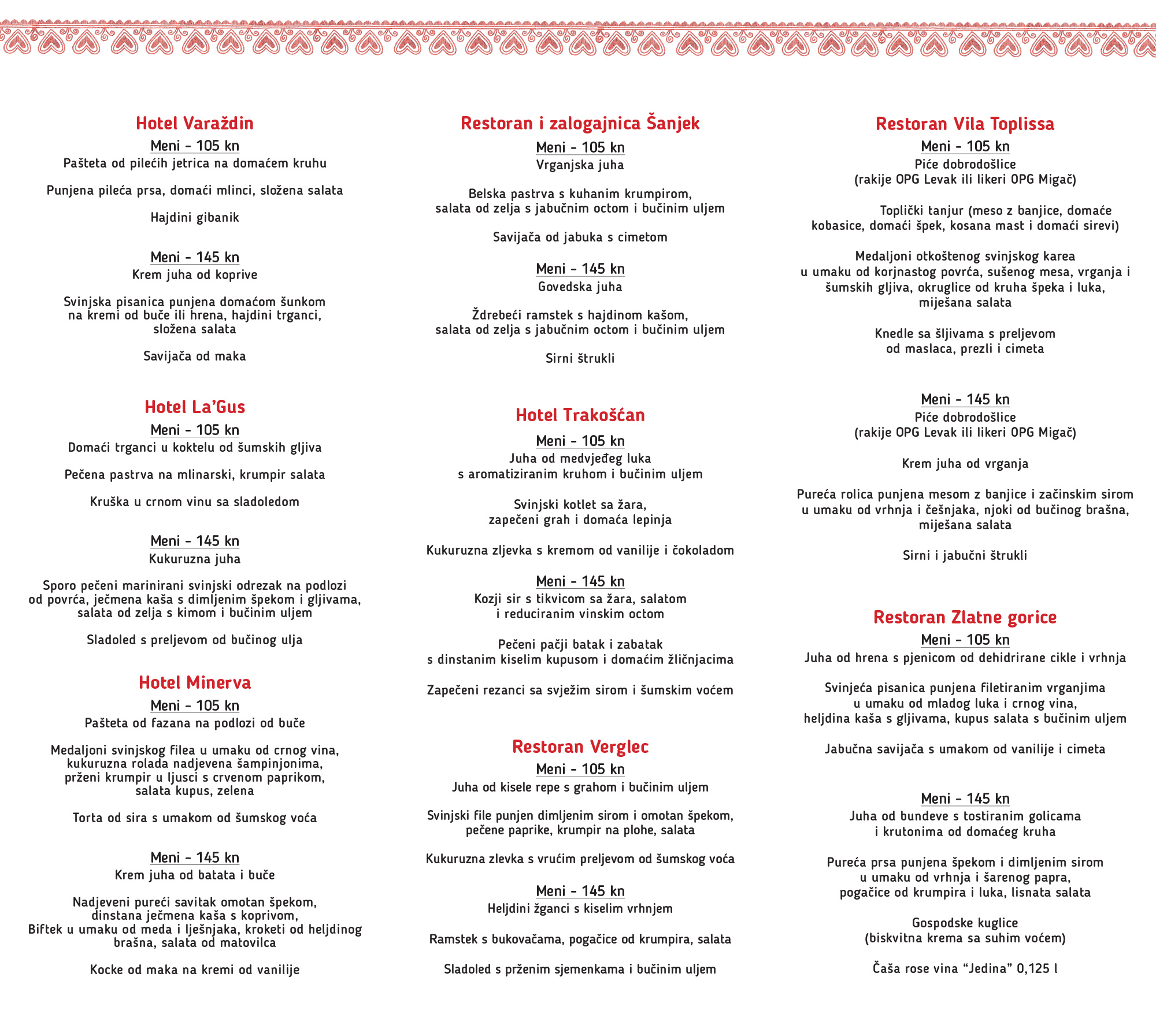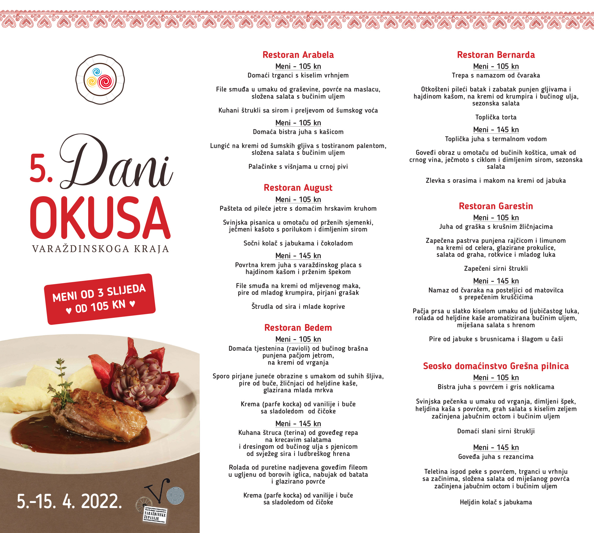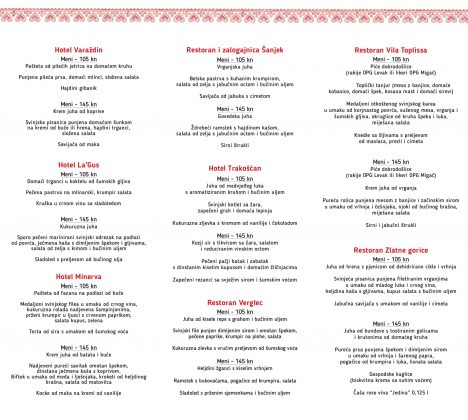 Na 5. Danima okusa varaždinskog kraja na meniju od tri slijeda po posebnim cijenama od 105 ili 145 kuna isprobajte domaće specijalitete. Fino, zdravo i domaće možete jesti u restoranima August, Arabela, Bedem, Bernarda, Garestin, Vila Toplissa, Zlatne Gorice, Verglec, Šanjek, u Seoskom domaćinstvu Grešna pilnica te u hotelima Varaždin, La’Gus, Minerva i Trakošćan.