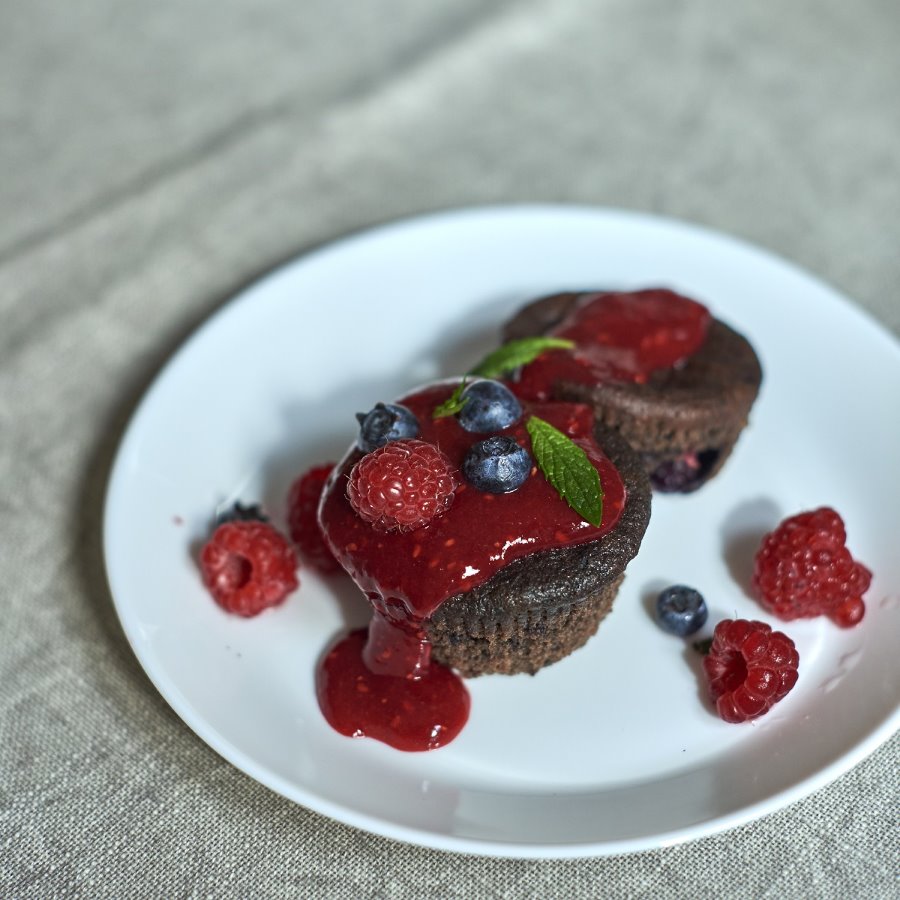 Muffini s borovnicama, malinama, jagodama s umakom od malina (za 12 muffina)