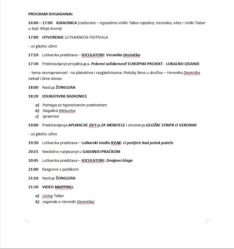 Dođite na igru, edukaciju, zabavu, glazbu i šalu u subotu popodne. Program počinje u 16 sati igraonicom za djecu Izgradimo Veliki Tabor zajedno, Veronika, vitez i Veliki Tabor u boji i Moja kruna. Bit će tu i lutkarska predstava, nastup žonglera, edukativna radionica, predstavljanje projekta ‘Položaj žena u društvu – Veronika Desinićka nekad i žene danas’…
