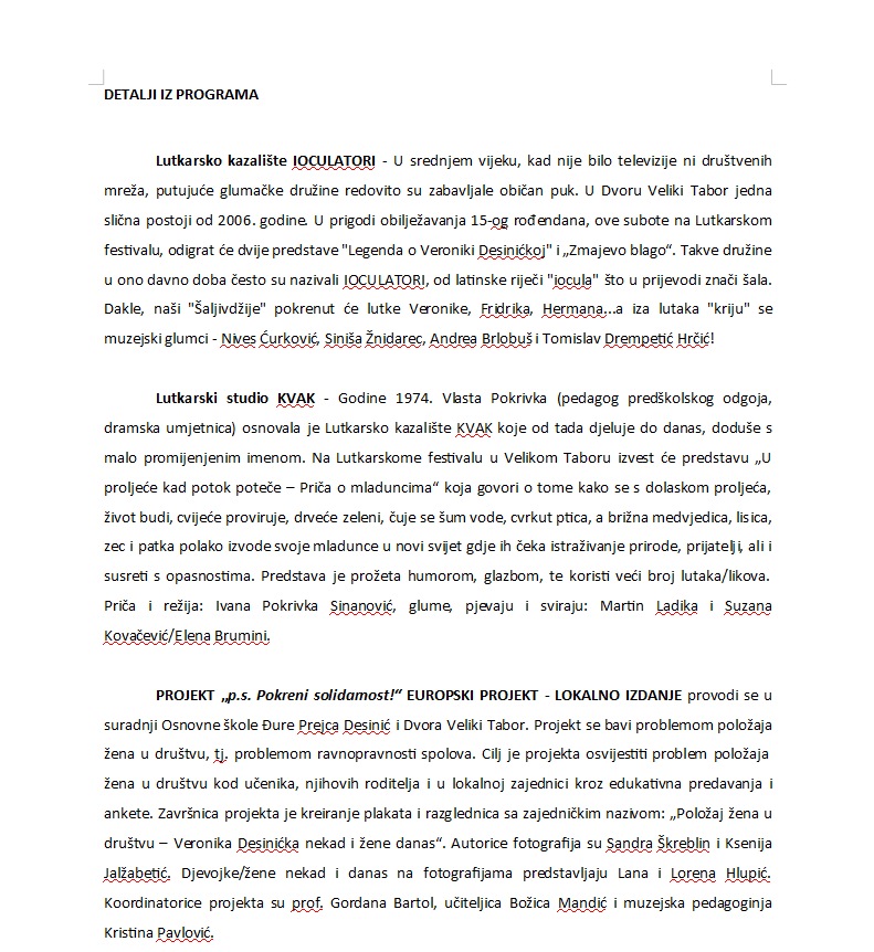 U Dvoru Veliki Tabor konstantno se i pažljivo brine o nematerijalnoj baštini. Zato su aktivnosti mnogobrojne i raznolike. Neke od njih bit će predstavljene ove subote, 29. svibnja na događanju nazvanom ‘Lutkarski festival u Velikom Taboru’.