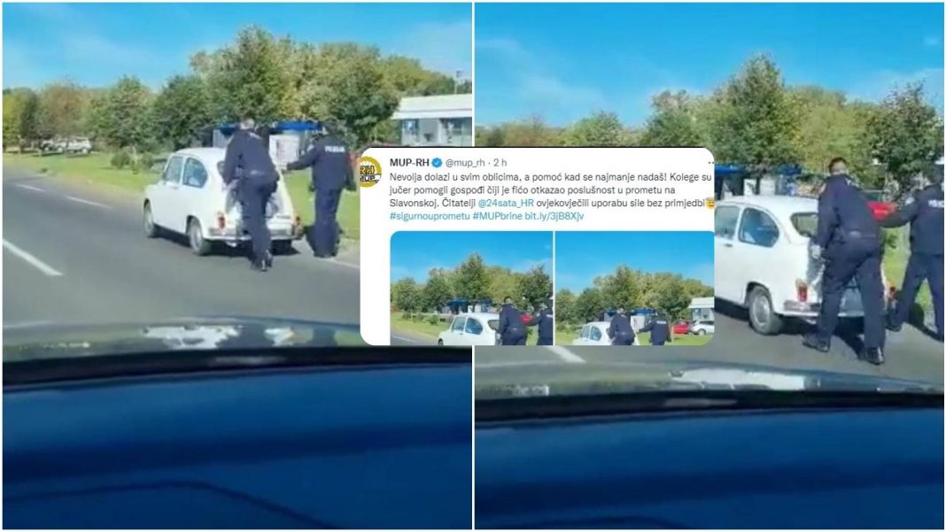 Objavio je to MUP na svom Twitter profilu, reagirajući na članak 24sata. Njima je čitatelj poslao fotografije i video sa Slavonske avenije u Zagrebu gdje su policajci ženi pomogli u nevolji. Fićo se, naime, ugasio. Dva su joj policajca uskočila u pomoć i odugarali Fiću s prometne ceste.
