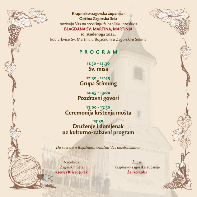 – Martinje je trenutak kada zajedno slavimo sve što predstavlja naš kraj, našu kulturu, predanost i ljubav prema vinogradu i vinu. Dragi Zagorci i Zagorke, pozivam vas da nam se pridružite u Bojačnom i da zajedno krstimo mošt, uživamo u druženju i čuvamo našu tradiciju – poručila je Ksenija Krivec Jurak, načelnica Zagorskih Sela.