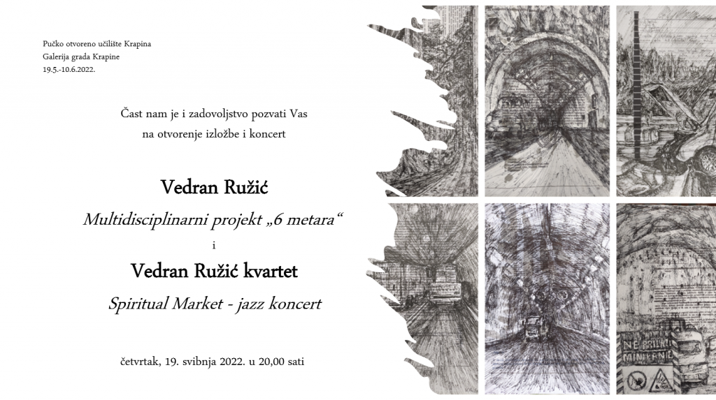 U četvrtak, 19. svibnja u 20 sati u Galeriji grada Krapine otvorenje je izložbe, Multidisciplinarnog projekta ‘6 metara’ mladog vizualnog umjetnika i jazz glazbenika Vedrana Ružića.