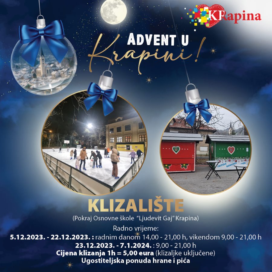 Kod Osnovne škole Ljudevit Gaj, pak, mogu otići klizači. Cijena klizanja za puni sat je pet eura, u cijenu su uključene i klizaljke. Klizalište je do 22. prosinca radnim danom otvoreno od 14 do 21 sat, vikendom od 9 do 21. Od 23. prosinca do 7. siječnja radit će svaki dan od 9 do 21 sat.