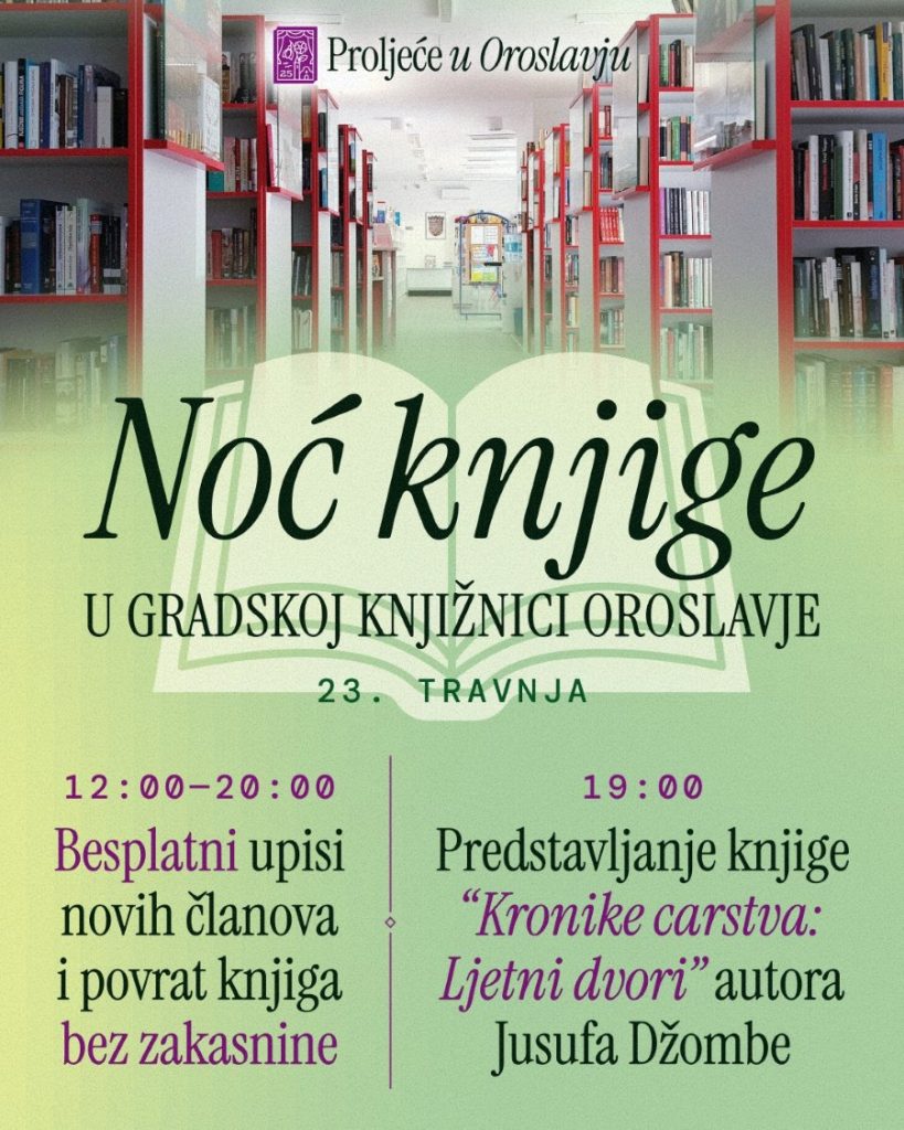 U Gradskoj knjižnici u srijedu, 23. travnja u sklopu manifestacije Proljeće u Oroslavju očekuje vas niz pogodnosti i zanimljivih sadržaja. Do 20 sati omogućeni su besplatni upisi za nove članove i povrat knjiga bez naplate zakasnine, čime se dodatno potiče čitateljska kultura među svim generacijama.