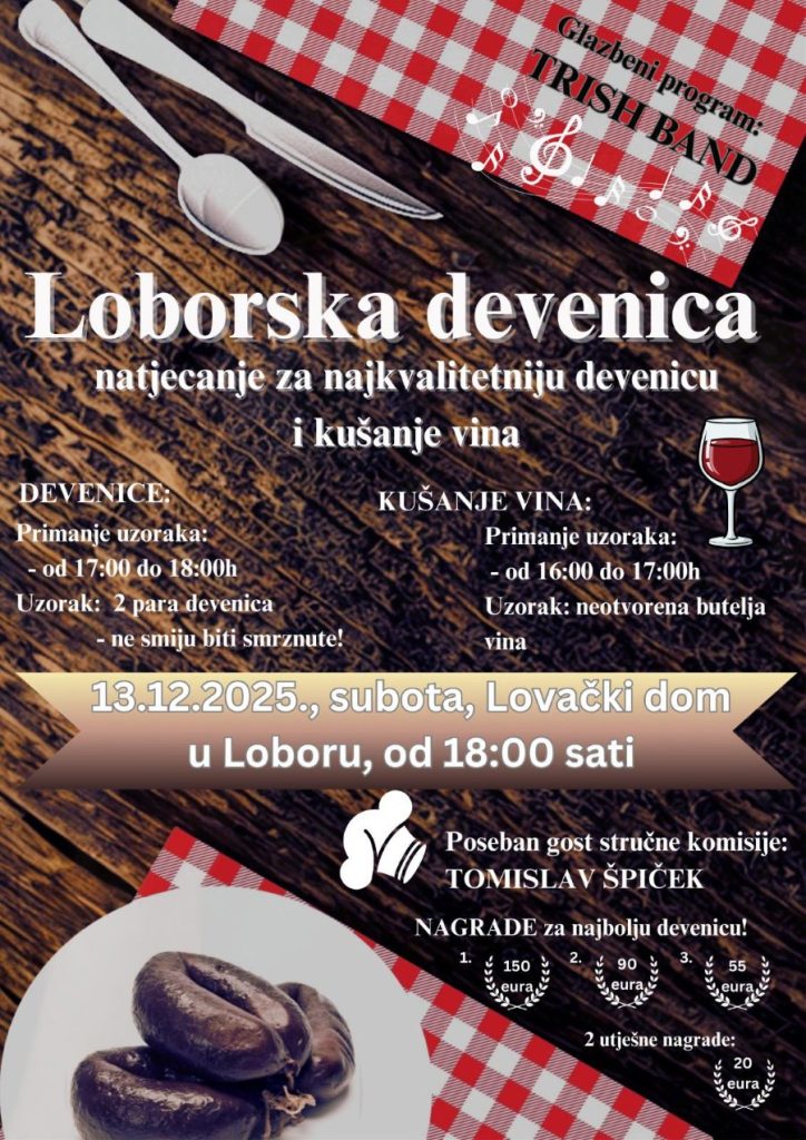 Općina Lobor i ove godine poziva sve ljubitelje domaćih delicija, druženja i bogate zagorske tradicije na Loborsku devenicu, manifestaciju koja je s godinama postala jedno od najprepoznatljivijih okupljanja u ovom dijelu Zagorja. Subota, 13. prosinca od 18 sati rezervirana je za mirise, okuse i veselu atmosferu u Lovačkom domu u Loboru.
