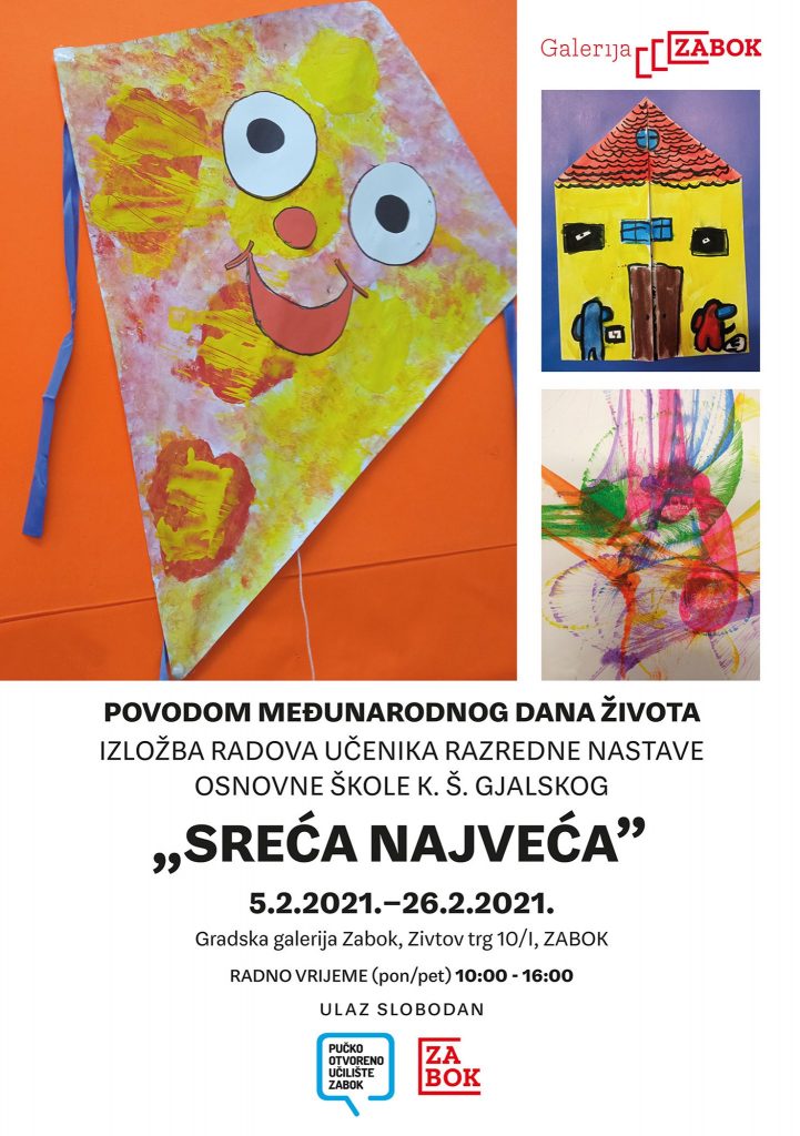 Izložba učeničkih radova otvara se povodom Međunarodnog dana života. Manifestacija Sreća najveća održava se sedmu godinu zaredom u suradnji s Osnovnom školom Ksavera Šandora Gjalskog Zabok u svrhu promicanja likovne kulture i umjetnosti kod djece.