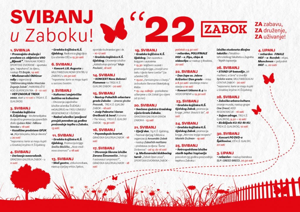 Uz izložbe, promocije knjiga, tu je i Dječji dan s Festivalom dječjeg folklora, Sajam udruga, Biciklijada KU – KU – RI – KU, Retrospektivna izložba starih tepiha i tapiserija povodom 55 godina proizvodnje tepiha u Zaboku… Tu je ZUK, Zabočka urbana kultura s urbanim događanjima i programom 28. svibnja kada će Zabok dobiti još jedan mural…