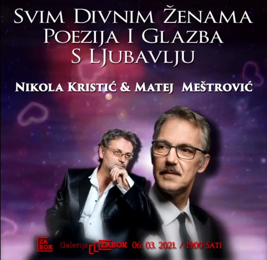 Program počinje u 19 sati. Zbog ograničenog broja sudionika, samo 25, obavezna je prijava na gradskagalerijazabok@gmail.com ili na broj telefona 099 707 1949. Glazbeno – poetsku večer, Nikola Kristić (poezija) i Matej Meštrović (klavir) moći ćete pratiti uživo putem linka na Facebook stranici Grad Zabok – info.