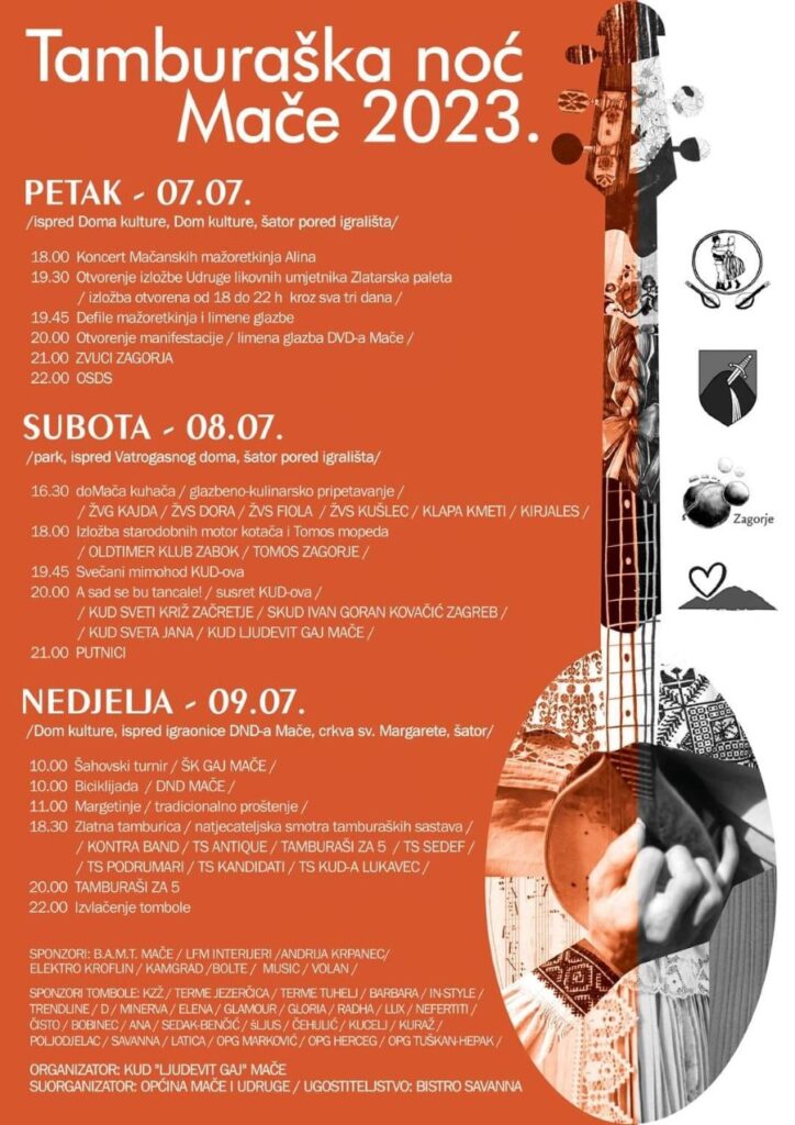 Od 7. do 9. srpnja najveća zabava u Hrvatskom zagorju je u Maču. Koncerti, izložbe, glazbeno-kulinarsko pripetavanje, zabava pod šatorom, natjecateljska smotra tamburaša… Bogat program i ove godine.