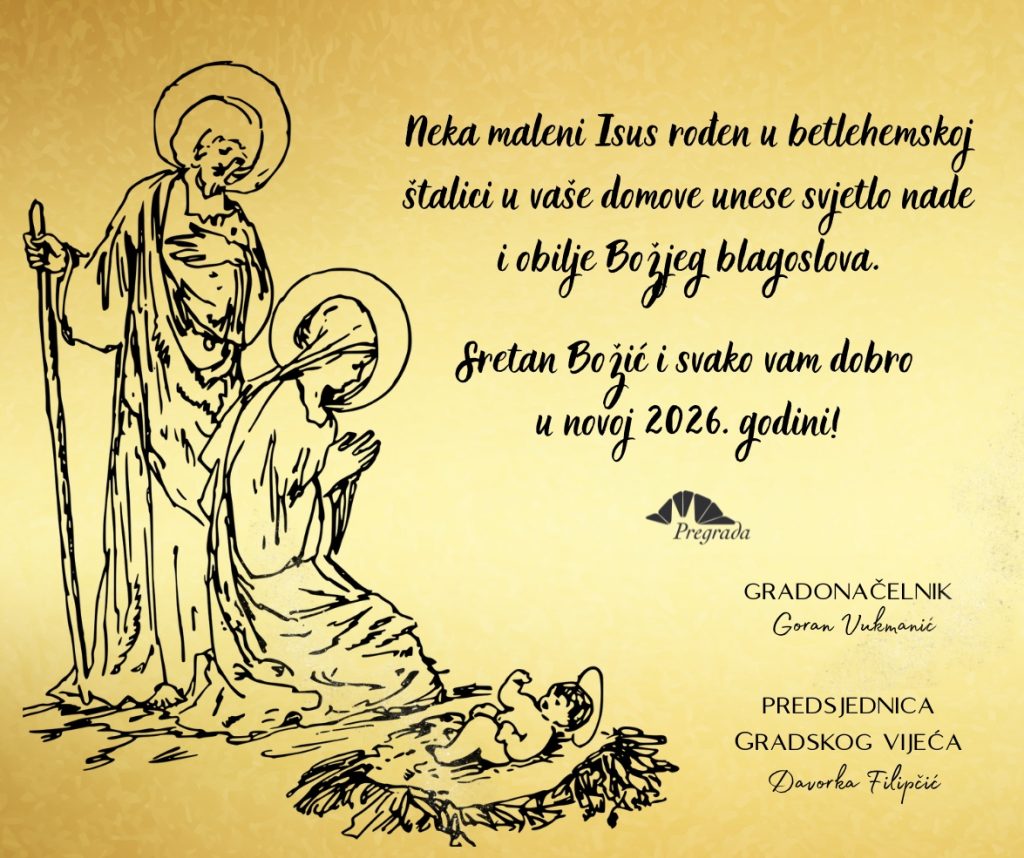 neka vam božićni blagdani donesu mir, sreću i toplinu obiteljskog zajedništva, a nova godina obilje zdravlja, uspjeha i radosnih trenutaka. Blagoslovljen Božić i sretnu novu 2026. godinu žele vam gradonačelnik Grada Pregrade Goran Vukmanić i predsjednica Gradskog vijeća Davorka Filipčić.