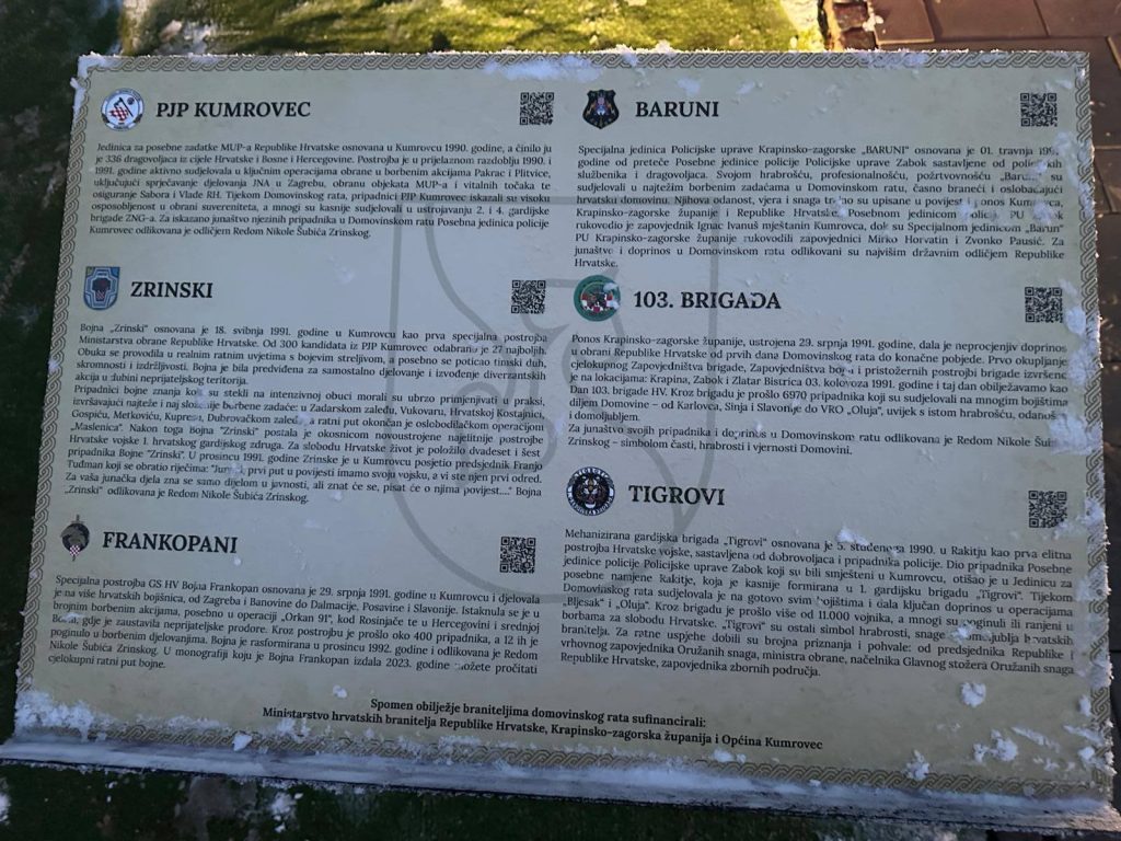 Posebna jedinica policije Kumrovec, jedinica za posebne zadatke u MUP-u Republike Hrvatske osnovana je u Kumrovcu 1990. s 336 dragovoljaca. Spomen-obilježje, postavljeno u središtu Kumrovca, posvećeno je pripadnicima Posebne jedinice policije Kumrovec 1990., Specijalne jedinice policije Barun, postrojbi Bojna Zrinski i Bojna Frankopan, 103. zagorske brigade te 1. gardijske brigade Tigrovi.