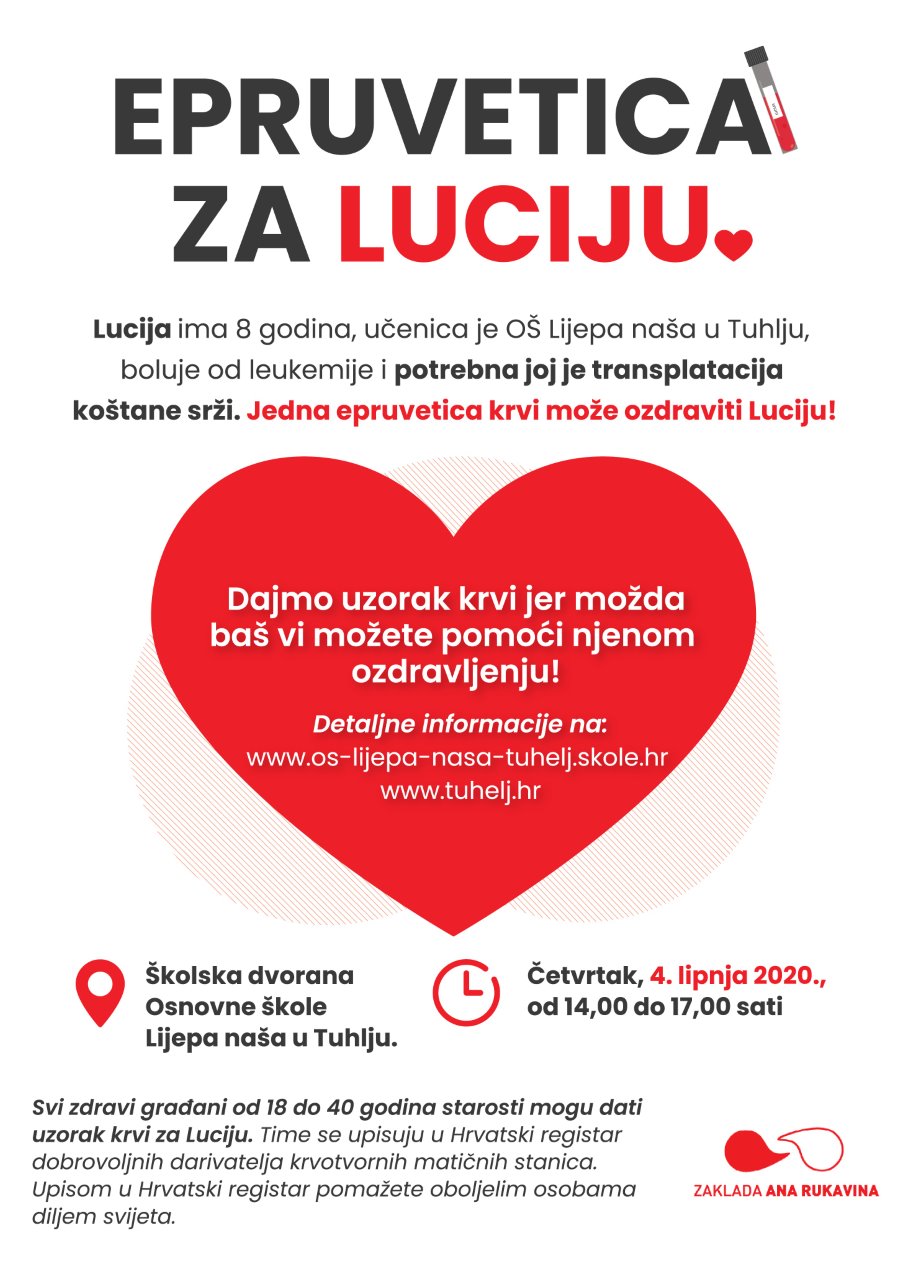 Zato Zaklada Ana Rukavina u četvrtak 4. lipnja od 14 do 17 sati u Lucijinoj Osnovnoj školi Lijepa naša u Tuhlju organizira akciju upisa u Hrvatski registar dobrovoljnih darivatelja krvotvornih matičnih stanica.