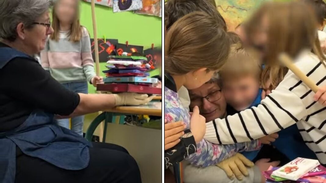 Učenici su spremačicu Biserku, koja odlazi u mirovinu, zamolili da sjedne za stol, zažmiri i ispruži ruke. Ne znajući što oni rade, mali školarci su joj ruke ispunili čokoladama.