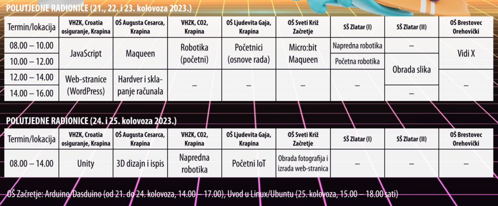 Ovogodišnja informatička škola bit će na šest lokacija: u Osnovnoj školi Augusta Cesarca i Ljudevita Gaja u Krapini, u Veleučilištu Hrvatsko zagorje Krapina, Srednjoj školi Zlatar, Osnovnoj školi Sveti Križ Začretje i u Osnovnoj školi Stjepana Radića u Brestovcu Orehovičkom.
