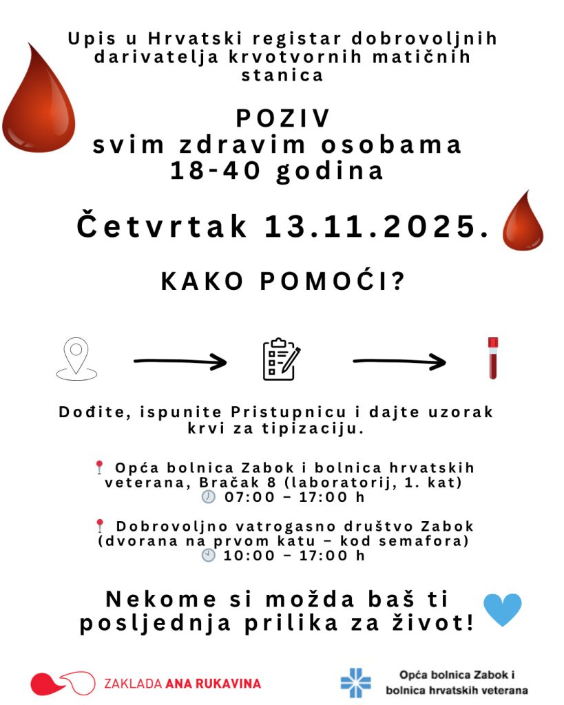 Zaklada Ana Rukavina i Opća bolnica Zabok i bolnica hrvatskih veterana pozivaju sve zdrave osobe od 18 do 40 godina da se u četvrtak, 13. studenog pridruže plemenitoj akciji upisa u Hrvatski registar dobrovoljnih darivatelja krvotvornih matičnih stanica.