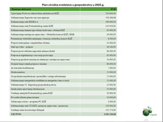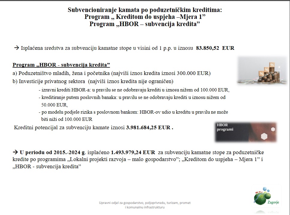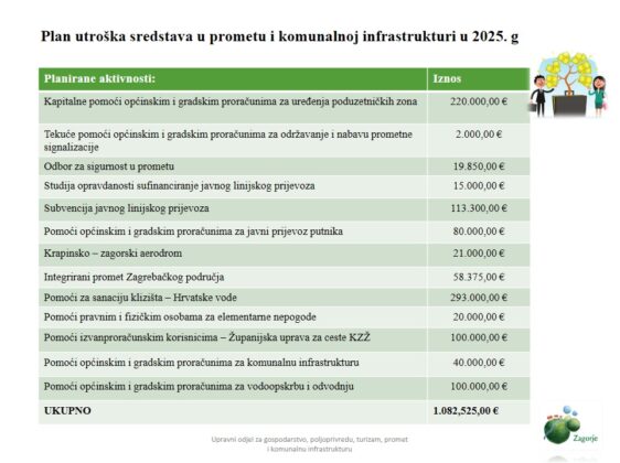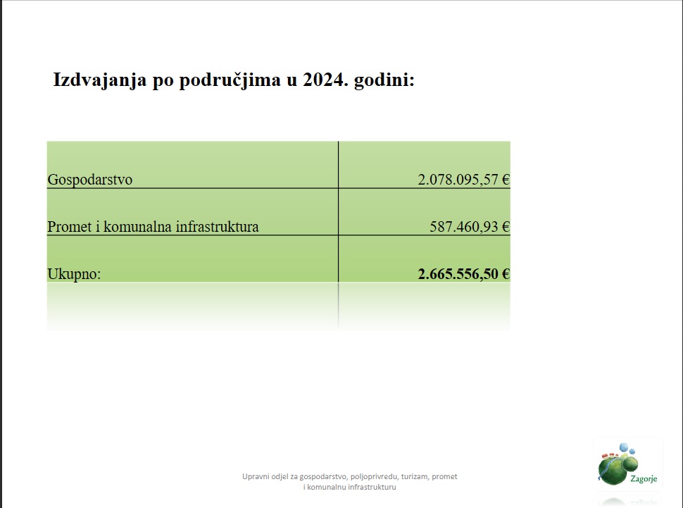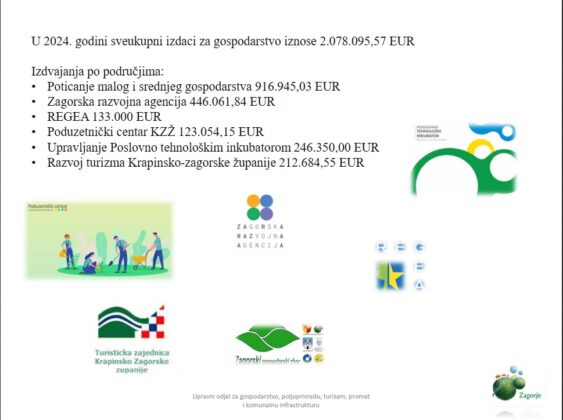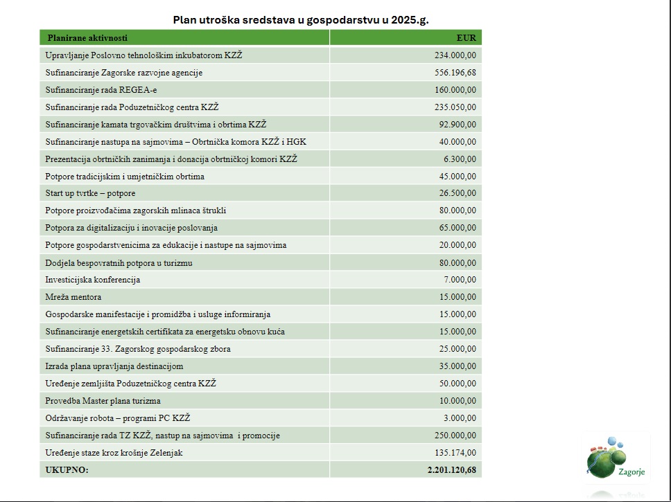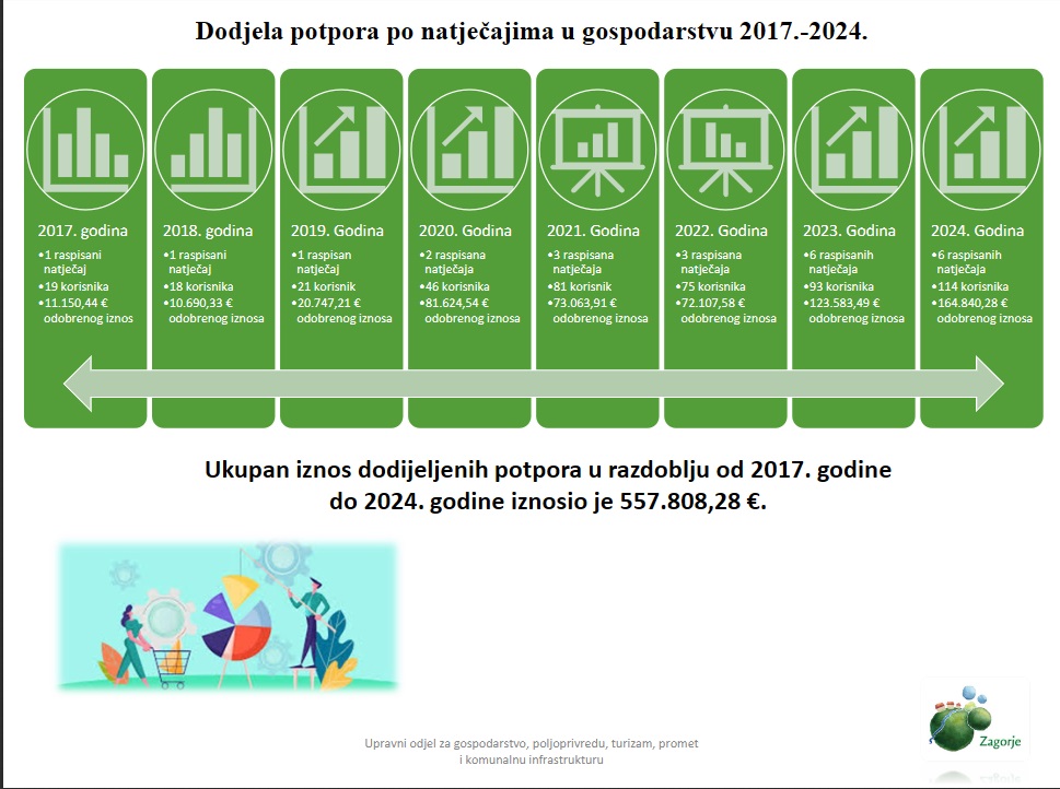 Krapinsko-zagorska županija u kontinuitetu osigurava sredstva za gospodarstvo i komunalnu infrastrukturu, namijenjena poduzetnicima i obrtnicima, te za javnu infrastrukturu koja je nužna za stvaranje dobrih preduvjeta za daljnji napredak i širenje proizvodnje.