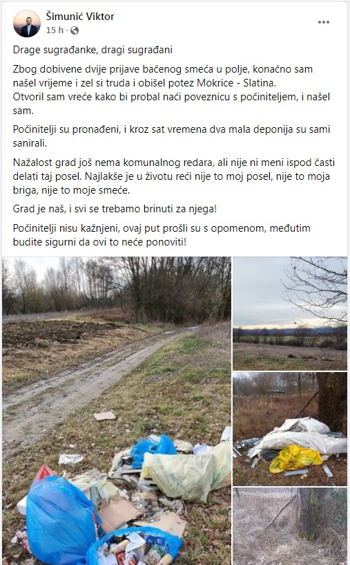 Dobio je dvije prijave da je na potezu Mokrice – Slatina bačeno smeće u polje. Kako je objavio na svom Facebook profilu, ‘našel je vrijeme i zel si je truda’.