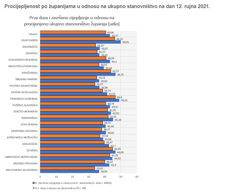 Prema službenim podacima Hrvatskog zavoda za javno zdravstvo od 12. rujna u KZŽ se u potpunosti, s obje doze procijepilo 38,27 posto ljudi u odnosu na broj stanovnika, dok je prvom dozom cijepljeno njih 40,82 posto.