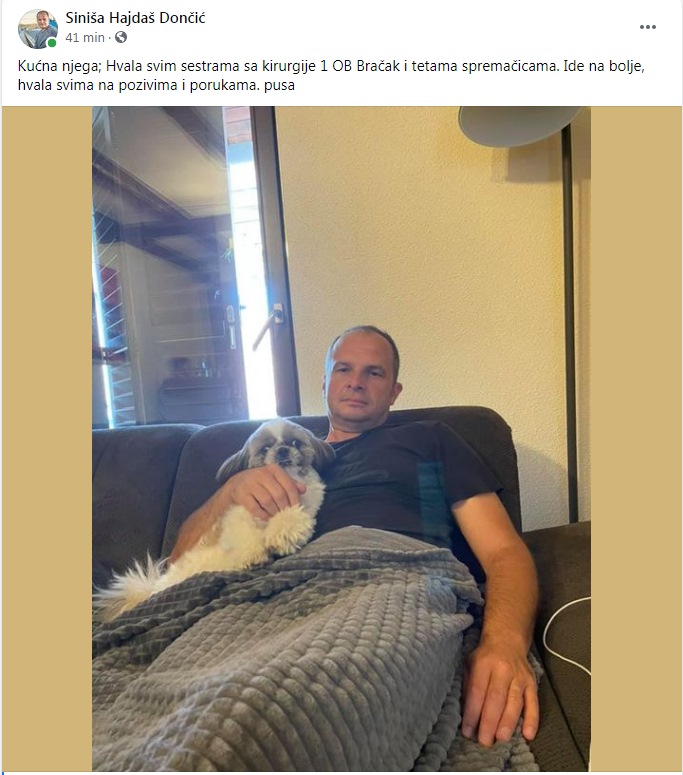 – Ide na bolje, hvala svima na pozivima i porukama. Pusa – objavio je uz fotografiju sa svojim kućnim ljubimcem, psićem Doksom koji se ne odvaja od njega.