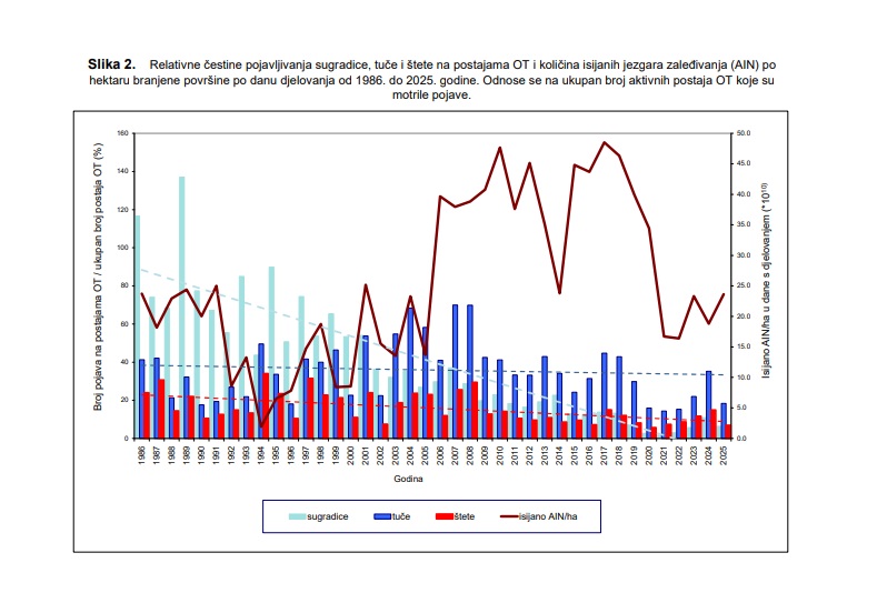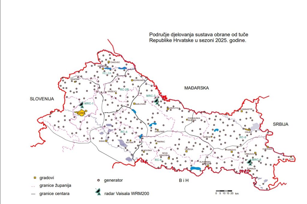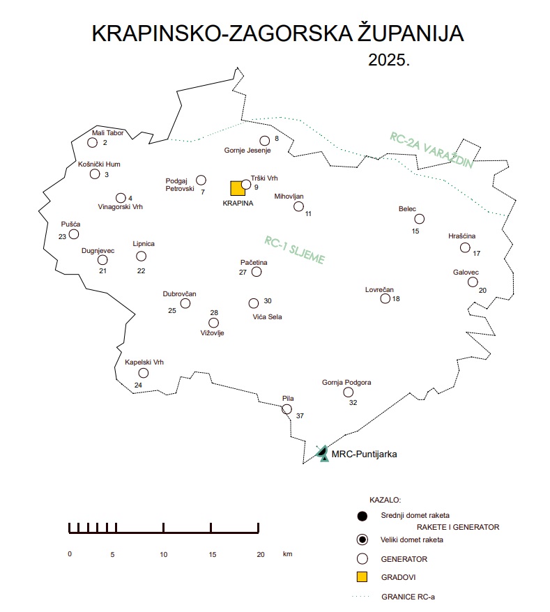 Prema godišnjem izvješću o radu sustava obrane od tuče DHMZ-a, područje Krapinsko-zagorske županije i u 2025. godini branjeno je s radarskog centra RC-1 Sljeme (Puntijarka) (21 GP i 0 LP). Na području županije aktivno je bilo 21 postaja za obranu od tuče (28 do 2020.). Sve postaje raspolagale su s prizemnim generatorom za OT. U sezoni OT 2025. na području županije nisu korištene rakete protiv tuče, kao i na cijelom branjenom području, a utrošeno je 1599 litara otopine srebrnog jodida za prizemne generatore u 22 dana s generatorskim akcijama. Na postajama za OT zabilježena su samo dva slučaja sugradice, bez pojave tuče i bez šteta.