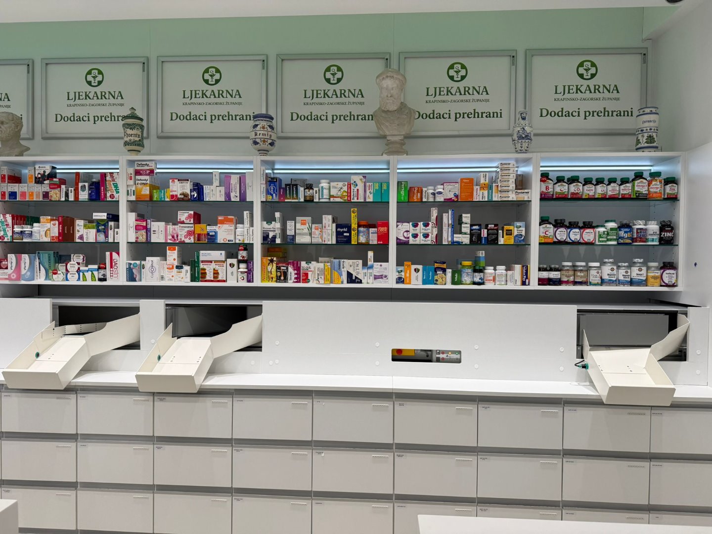 Ljekarna Krapinsko-zagorske županije u Zaboku jedina je u županiji koja ima 24-satno dežurstvo. Na dan izdaje oko 600 lijekova za oko 400 recepata. Osim adaptacije i uređenja, uveli su automatizirano robotsko skladište koje omogućuje potpuno automatizirano punjenje skladišta lijekovima, kontrolu rokova trajanja, njihovu distribuciju na pultove.