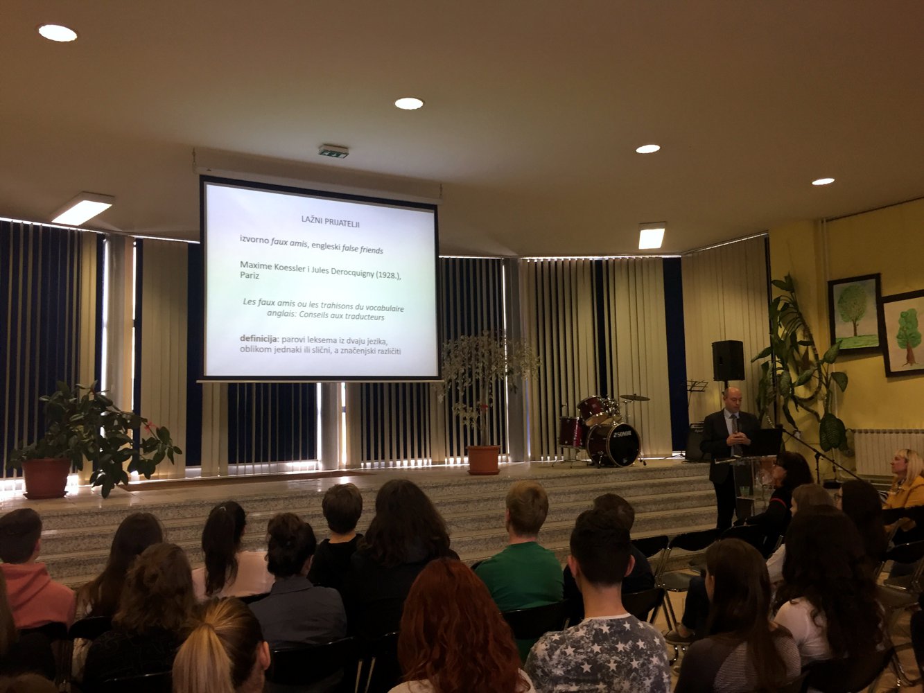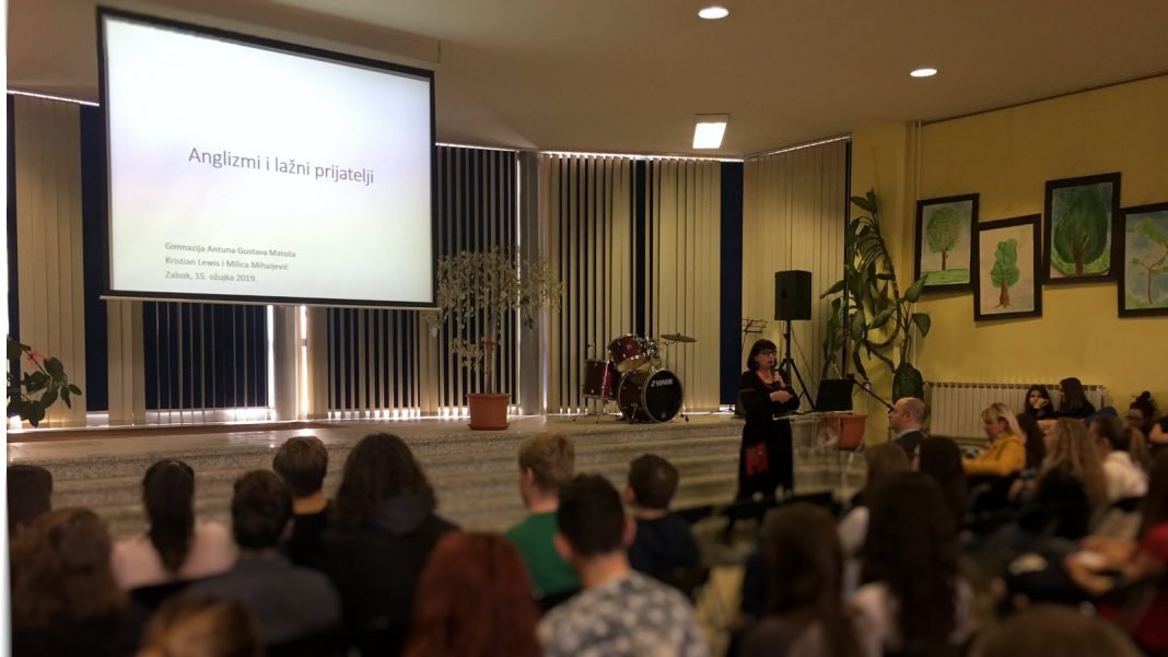 Gimnazijalci iz Zaboka ove su godine ugostili znanstvenike s Instituta za jezik i jezikoslovlje, dr. sc. Milicu Mihaljević, voditeljicu Odsjeka za hrvatski standardni jezik, i dr. sc. Kristiana Lewisa, višeg znanstvenog suradnika na istom Odsjeku. Predavali su im o anglizmima, žargonizmima i lažnim prijateljima u hrvatskome jeziku. Učenici su naučili da se u jezičnom doticaju stvaraju jezični nadomjesci, križanci, ali i hibridni (hrvatsko-engleski ili iskrivljeni engleski) jezik, jezik nedovoljno osviještenih, ali i nedovoljno obrazovanih.