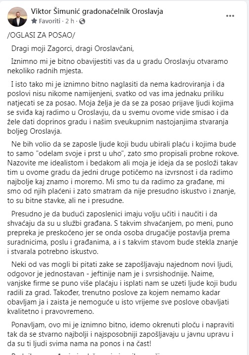 – Nema kadroviranja i poslovi nisu nikome namijenjeni, svatko od vas ima jednaku priliku natjecati se za posao. Moja želja je da se za posao prijave ljudi kojima se sviđa kaj radimo u Oroslavju, da u svemu ovome vide smisao i da žele dati doprinos gradu – poručio je na Facebooku gradonačelnik Oroslavja Viktor Šimunić.