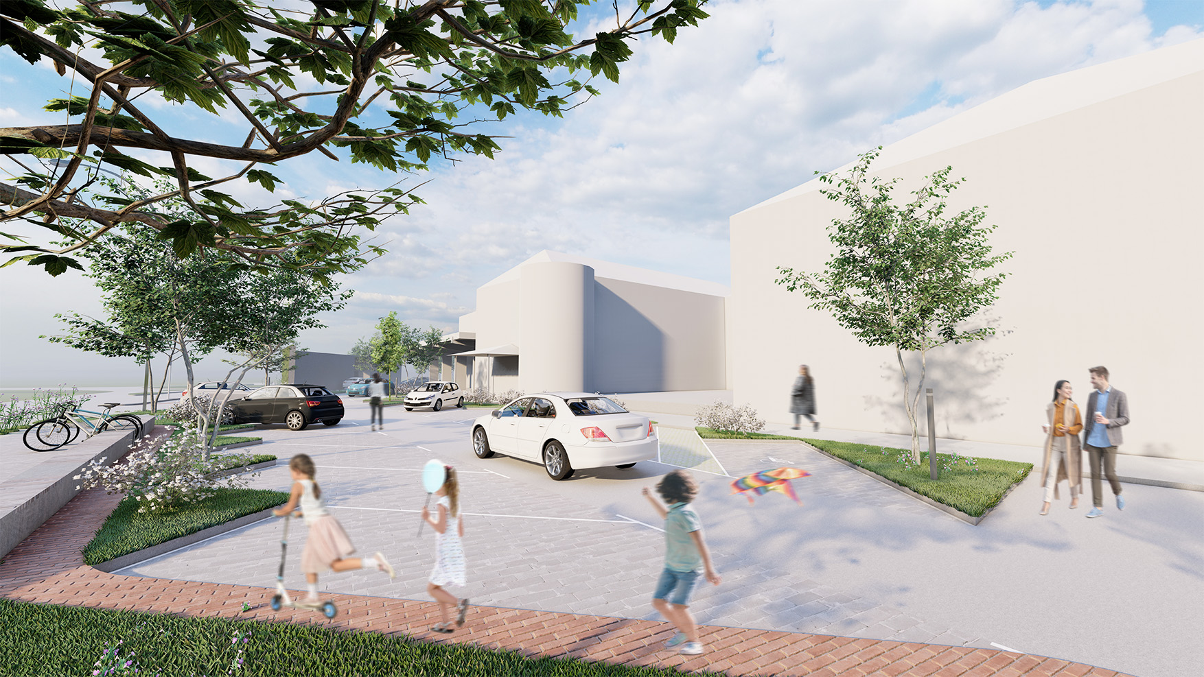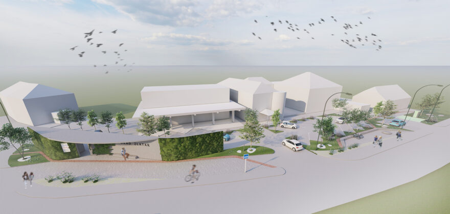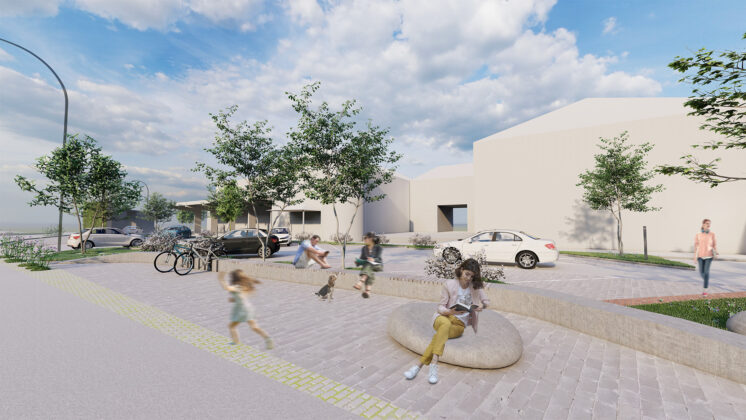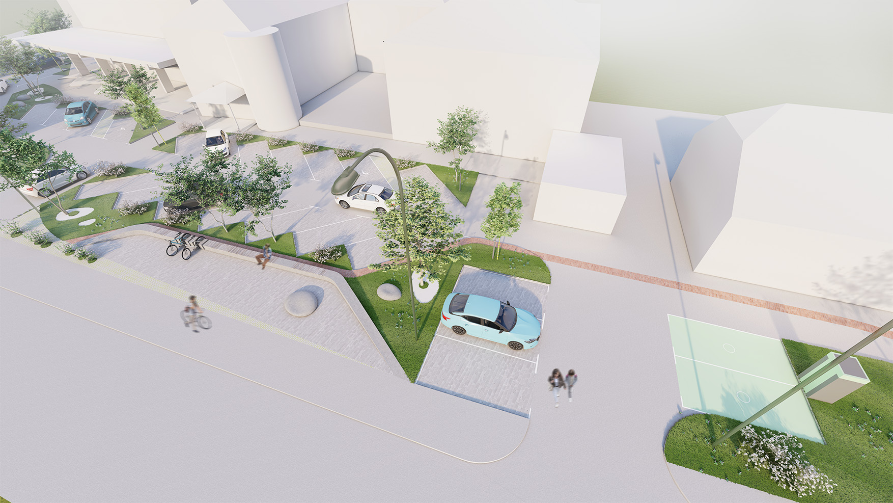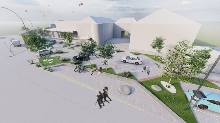 Organizacija potrebnih parkirnih mjesta predviđena je unutar cijelog obuhvata, ali u zapadnom dijelu parcele kako bi se promet vizualno ‘pomaknuo’ u stražnji dio. Na sjevernom dijelu parcele formiran je uvučeni trg kao dodatna vrijednost i novi prostor za sjedenje i okupljanje uz postojeći pločnik.