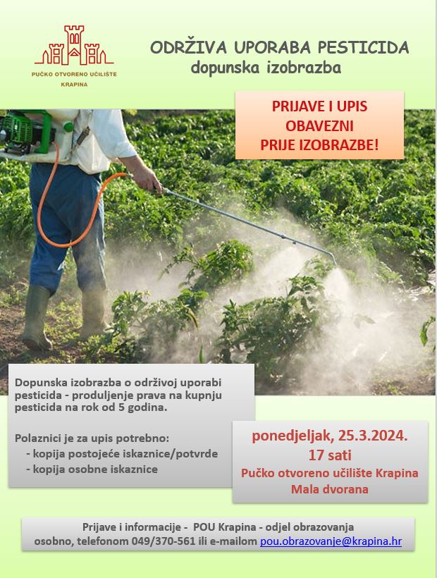 Znanja se stječu izobrazbom koju provodi Pučko otvoreno učilište Krapina temeljem ovlaštenja Ministarstva poljoprivrede. Izobrazba se provodi kroz dva modula, osnovni i dopunski, a po završetku se produljuje pravo na kupnju pesticida na rok od pet godina. Prijavu i upis na izobrazbu možete obaviti u Pučkom otvorenom učilištu Krapina od ponedjeljka do petka od 7 do 15 sati ili online na https://fis.mps.hr/najave/izobrazbe.