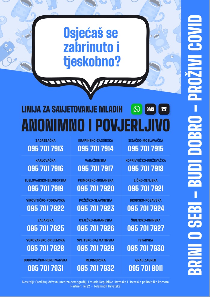 – Svjesni situacije koje je pred mlade u Hrvatskoj stavila pandemija koronavirusa te izazova koje je donijelo ‘novo normalno’, željeli smo doznati koji su njihovi najveći problemi i dobiti izravna saznanja o utjecaju pandemije na njihove živote i mentalno zdravlje. Uvidjeli smo potrebu za sustavnom i stručnom podrškom mladima, pa smo u suradnji s Hrvatskom psihološkom komorom pokrenuli linije za telefonsko savjetovanje mladih. Mladima želimo poručiti kako ih razumijemo. Nadamo da će im ovakva podrška biti jedan od načina da lakše prebrode trenutnu situaciju – poručila je Željka Josić, državna tajnica Središnjeg državnog ureda za demografiju i mlade.