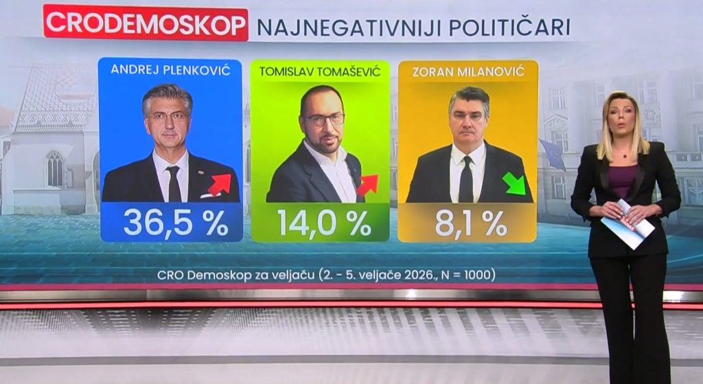 Na listi najnegativnijih političara i dalje je Plenković, uz rast negativnog doživljaja od gotovo četiri postotna boda u odnosu na kraj godine. Sada je na 36,5 posto, a u prosincu je bio na 32,9 posto. Taj je doživljaj gotovo utrostručio Tomislav Tomašević (14,0 posto), koji je prvi put drugi izbor najnegativca (prema 5,4 posto iz prosinca). Zoran Milanović s 8,1 posto sada je treći izbor najnegativnijeg, objavio je RTL Danas, čije rezultate cijele ankete možete vidjeti ovdje.