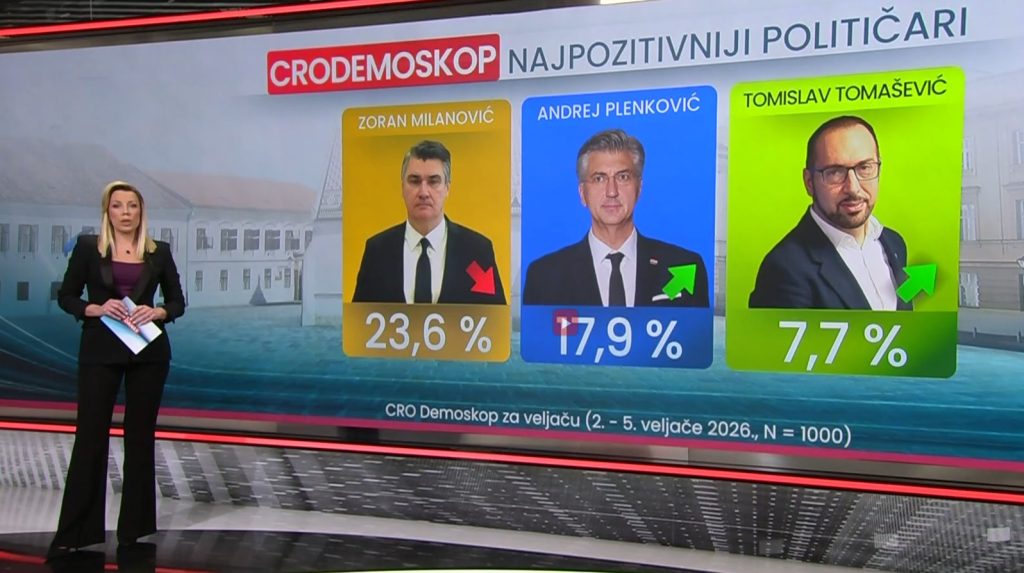 Najpozitivniji političar i dalje je predsjednik Zoran Milanović s 23,6 posto, što je pad u odnosu na 26 posto iz prosinca i njegov najlošiji rejting u posljednjih godinu dana. U istom razdoblju ovo je najbolji rejting premijera Andreja Plenkovića. Skočio je za šest i pol postotnih bodova u odnosu na prosinac. Sada je na 17,9 posto, dok je u prosincu prošle godine bio na 11,5 posto. Značajan rast bilježi i zagrebački gradonačelnik Tomašević. S 4,1 posto u prosincu sada je najpozitivniji za 7,7 posto ispitanika.