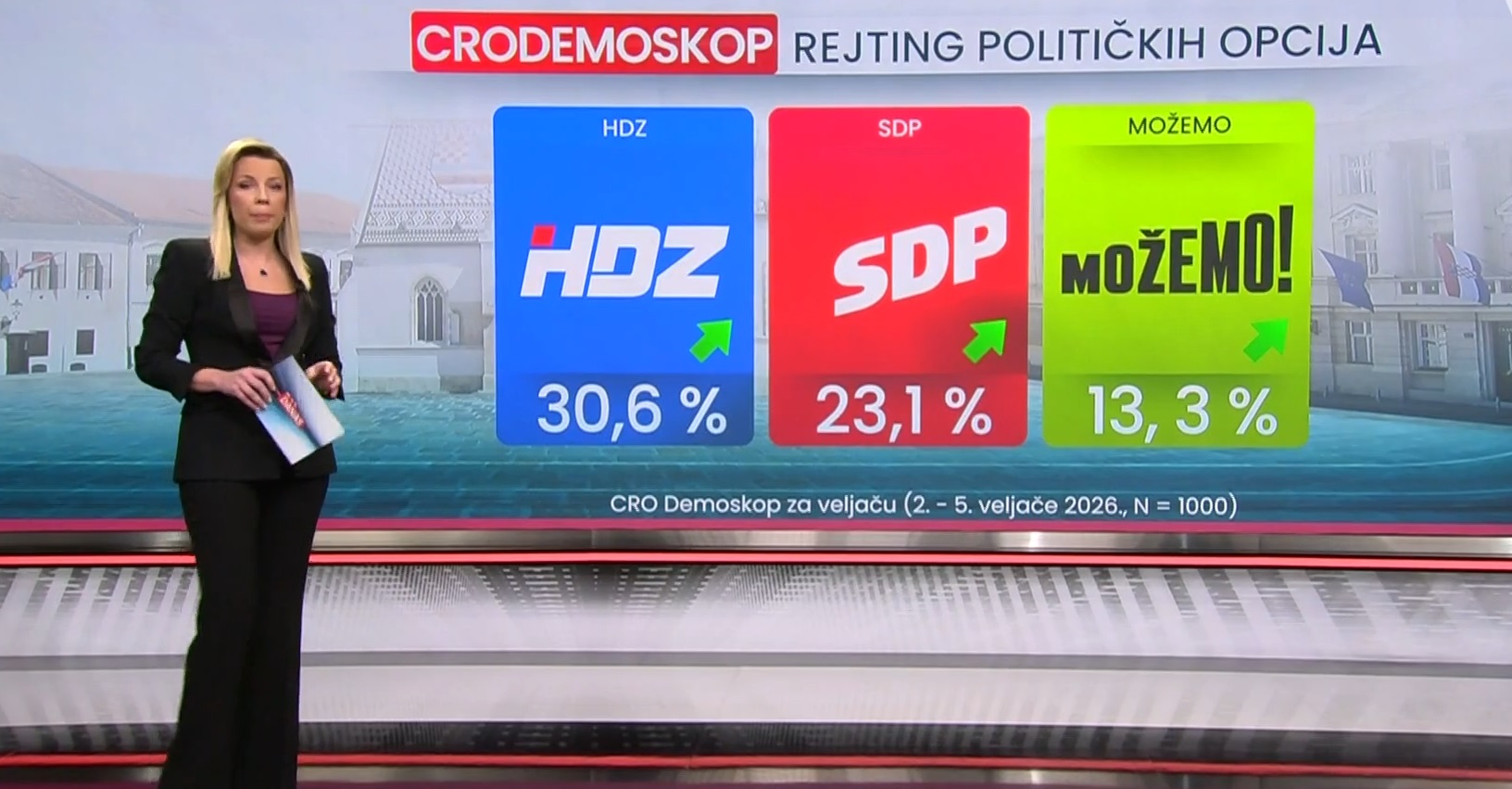 Istraživanje je provedeno neposredno nakon dočeka rukometaša, koji je uzbunio i ljevicu i desnicu, a prema rezultatima najviše su profitirali – HDZ i premijer Andrej Plenković. Vladajuća stranka dugo nije bila iznad 30 posto, a u veljači je, uvjerljivo prvi izbor s 30,6 posto, u odnosu na 27,5 posto iz posljednjeg mjerenja u prosincu. To je rast od tri postotna boda u odnosu na kraj godine. SDP ostaje drugi izbor s 23,1 posto, uz slični, nešto viši rejting nego u prosincu kada su imali 22,5 posto. Rast bilježi i Možemo!, ali manji od jednog postotnog boda. Sada su na 13,3 posto, u odnosu na 12,4 posto u prosincu.