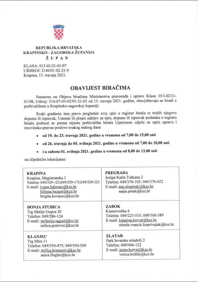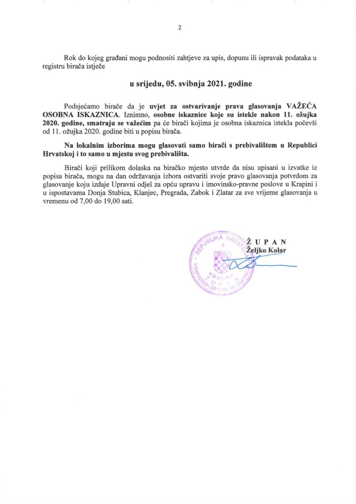 Rok za podnošenje zahtjeva za upis, dopunu ili ispravak podataka u registru birača je 5. svibnja