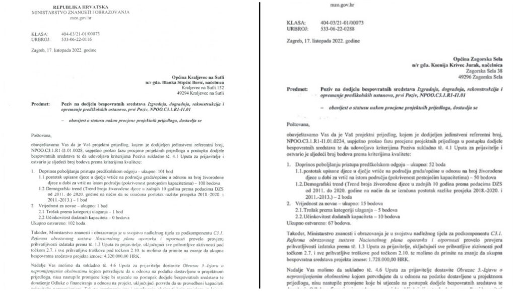 I Oroslavju je odobreno 6.480.00,00 kuna i to za izgradnju područnog vrtića u Mokricama. Bespovratnih 4.320.000,00 kuna dobila je i Općina Kraljevec na Sutli. Područni vrtić gradit će i Grad Pregrada i to u partnerstvu s Općinom Kraljevec na Sutli. Odobreno im je bespovratnih 5.471.999,99 za izgradnju područnog objekta Dječjeg vrtića Naša radost. Ukupna procijenjena vrijednost projekta iznosi 11.761.500,00 kuna.