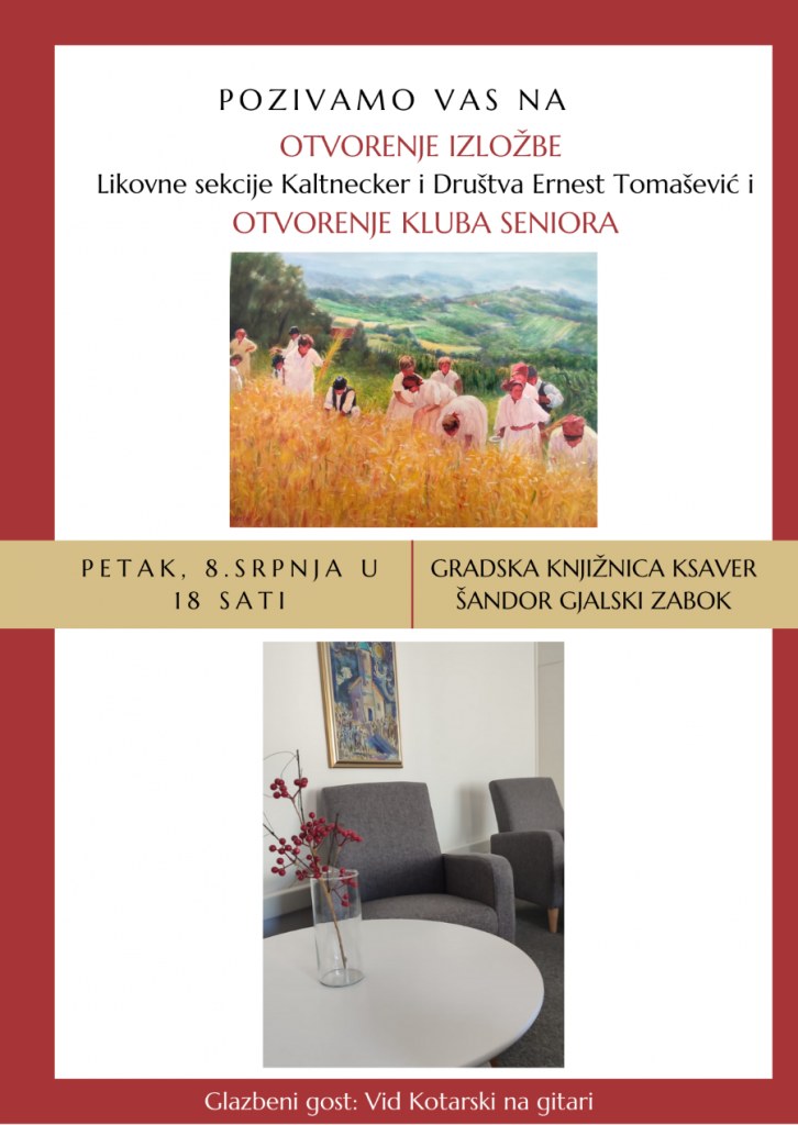 Dnevni boravak Klub seniora imat će i svoje svečano otvorenje i to u petak, 8. srpnja u 18 sati kada se otvara i izložba Likovne sekcije Kaltnecker i Društva Ernest Tomašević.