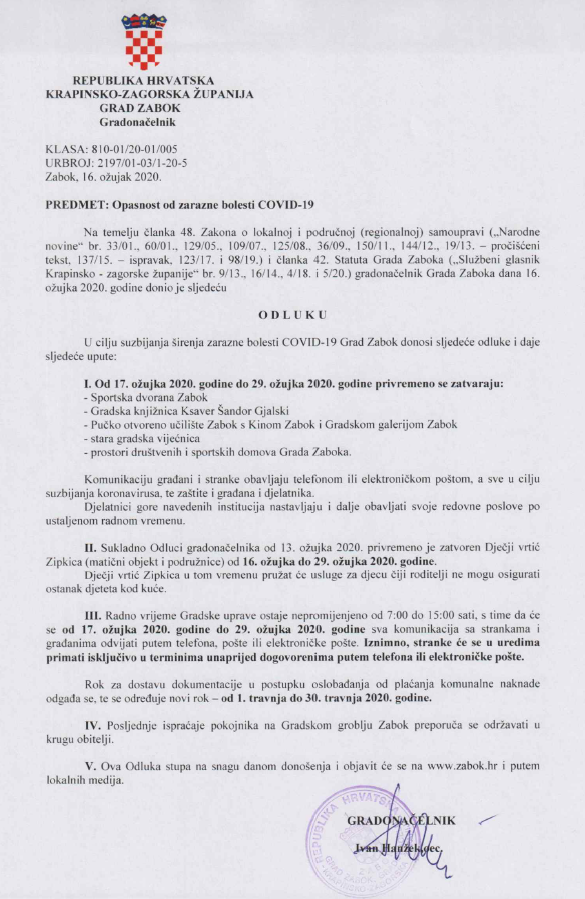 Tako se od 17. do 29. ožujka privremeno zatvaraju Sportska dvorana Zabok, Gradska knjižnica Ksaver Šandor Gjalski, Pučko otvoreno učilište s Kinom Zabok i Gradskom galerijom, stara gradska vijećnica te svi prostori društvenih i sportskih domova Grada.