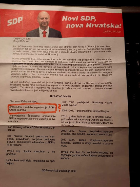 Opet greška u distribuciji. Članovi SDP-a dobili su pismo Željka Kolara u kojem kaže da je bio predsjednik Gradske organizacije Zagreba