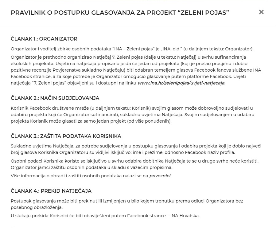 Od tada više nitko nije mogao dati svoj glas za projekte škola koje su se prijavile na INA-in natječaj 7. Zeleni pojas. Za nagradu od 20.000 kuna za svoje projekte natječu se Srednja škola Matija Antun Reljković iz Slavonskog Broda, Srednja škola Bedekovčina i Dječji vrtić Pjerina Verbanac iz Labina.