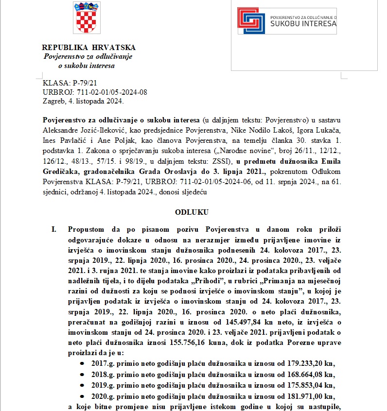 Povjerenstvo je i od Grada Oroslavja u dva navrata, 27. travnja i 29. srpnja 2021. zatražilo očitovanje o visini plaće (bruto i neto), ali Grad na te zahtjeve nije odgovorio. Bivši HDZ-ov gradonačelnik i Povjerenstvo još su krajem 2023. i početkom 2024. pokušali uskladiti podatke, ali bezuspješno. Na koncu je Povjerenstvo za odlučivanje o sukobu interesa u listopadu 2024., a koju odluku su objavili tek 17. veljače ove godine, utvrdilo kako je ‘proteklo više od 12 mjeseci od dana prestanka obnašanja dužnosti gradonačelnika Grada Oroslavja, pa Povjerenstvo u odnosu na dužnosnika Emila Gredičaka smatra da u konkretnom slučaju nije svrsishodno izricanje sankcije s obzirom da je nije moguće izvršiti‘. Gredičak, naime, više nije gradonačelnik pa ga ne mogu novčano kazniti, odnosno provesti obustavu isplate dijela neto plaće.